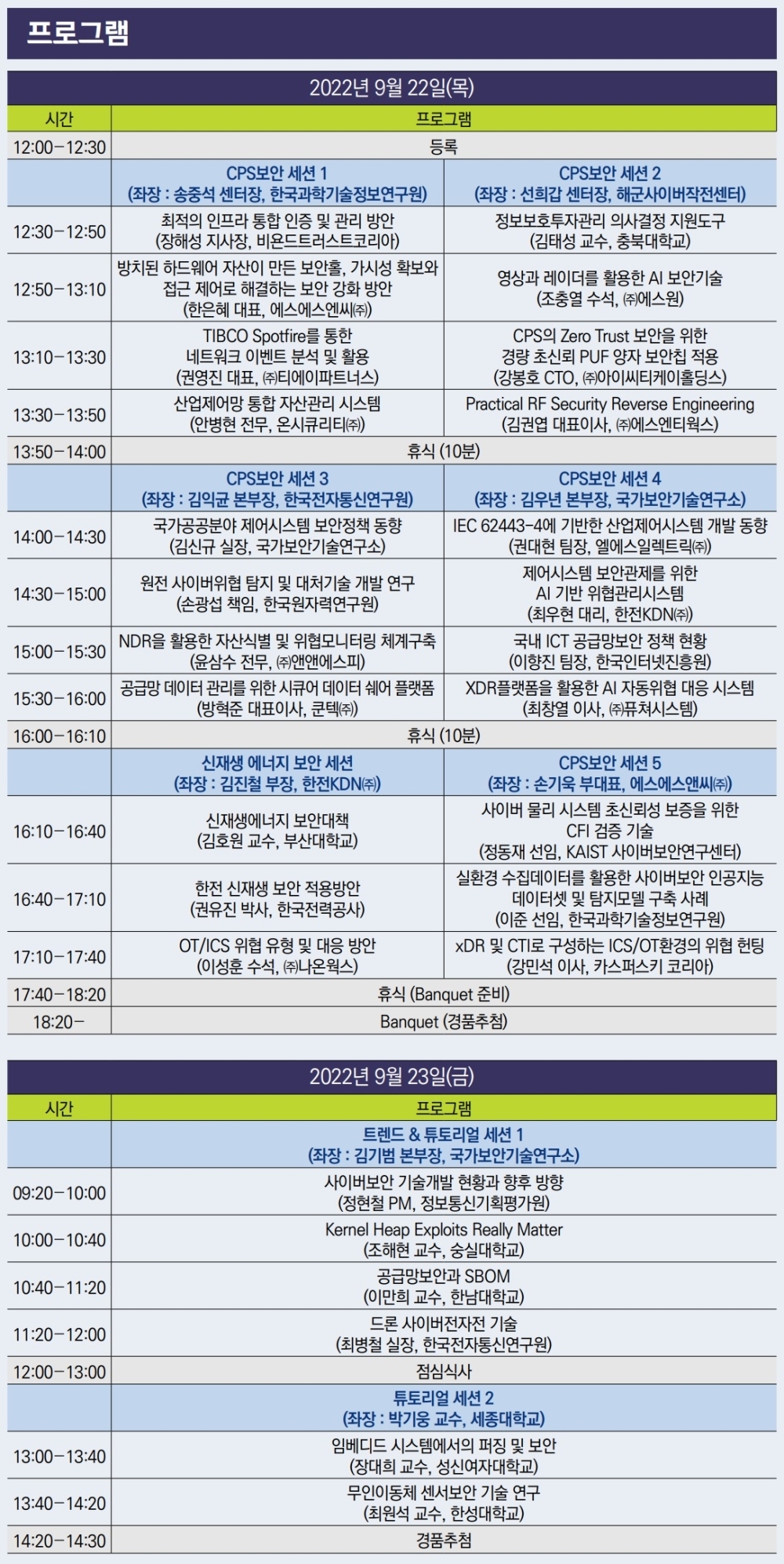 Çà»ç ù³¯ÀÎ 22ÀÏÀº ÃÑ 6°³ ¼¼¼ÇÀ¸·Î ÁøÇàµÇ¸ç, °ø°øºÐ¾ß Á¦¾î½Ã½ºÅÛ°ú AI ±â¹Ý Á¦¾î½Ã½ºÅÛ À§Çù°ü¸®, ¿øÀü »çÀ̹öÀ§Çù ŽÁö µî ´Ù¾çÇÑ ºÐ¾ß¿¡¼ÀÇ CPS º¸¾È¿¡ ´ëÇÑ ¼¼¹Ì³ª°¡ ÁøÇàµÈ´Ù. 23ÀÏ¿¡´Â Æ®·»µå & Æ©Å丮¾ó ¼¼¼ÇÀ» ÅëÇØ »çÀ̹ö º¸¾È ±â¼ú°³¹ß ÇöȲºÎÅÍ µå·Ð°ú ¹«ÀÎÀ̵¿Ã¼ ¼¾¼º¸¾È ±â¼ú ¿¬±¸ µîÀÌ ¼Ò°³µÈ´Ù.