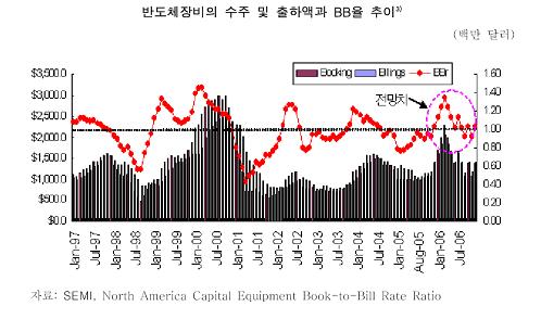 ÇÑÆí ¹ÝµµÃ¼ °æ±âÀÇ ¼±ÇàÁöÇ¥ÀÎ ¹ÝµµÃ¼ Àåºñ BBÀ²ÀÌ 2005³â 1¿ù 0.78ÀÇ ÀúÁ¡À» ±â·ÏÇÑ ÈÄ ÇϹݱâ ÀÌÈÄ 0.9´ë·Î ¿Ï¸¸ÇÑ »ó½Â ÁßÀÌ´Ù. SEMI(±¹Á¦¹ÝµµÃ¼ÀåºñÀç·áÇùȸ)´Â 2006³â BBÀ²ÀÌ »ó°íÇÏÀú(ß¾ÍÔù»î¸)ÀÇ ÇüŸ¦ º¸ÀÏ °ÍÀ¸·Î Àü¸ÁµÅ ´çºÐ°£ ȸº¹¼¼°¡ Áö¼ÓµÉ °ÍÀ¸·Î ¿¹»óÇß´Ù. IT »ý»êÀº È£Á¶¼¼À̳ª Á¦Ç°°¡°ÝÀÌ Ç϶ôÇÔ¿¡ µû¶ó Àüü ¸ÅÃâÁõ°¡À²ÀÌ ´Ù¼Ò ¼ÒÆøÀÏ °ÍÀÌ´Ù. ÈÄ¹ß ±â¾÷ ¹× °æÀï±â¾÷°úÀÇ °¡°Ý°æÀï ¹× Ç°Áú, µðÀÚÀÎ °æÀï ½ÉȰ¡ ¿¹»óµÇ¸ç Nano-Tech, Bio-Tech µî°ú µðÁöÅÐ ÄÁ¹öÀü½ºÀÇ ÁøÇà°ú ¹ÝµµÃ¼ »ê¾÷ÀÇ ºò¹ð ÃâÇö °¡´É¼ºÀ¸·Î ºÒÈ®½Ç¼ºÀÌ Áõ°¡ÇÒ °ÍÀÌ´Ù.
