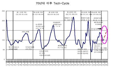 ÀÌó·³ IT °æ±âÀü¸ÁÀº Tech-Cycle( BBÀ²)À» ±Ù°ÅÇÑ °ÍÀ¸·Î Tech-Cycle Àº '05³â 2/4ºÐ±â ÀÌÈÄ »ó½Â±¹¸é¿¡ ÁøÀÔ Tech CycleÀº 70³â´ë ÀÌÈÄ 6¹øÀÇ °æ±â»çÀÌŬÀ» °æÇèÇß°í ÇöÀç´Â Á¦7¼øÈ¯ »ó½Â±¹¸éÀÇ Ãʱâ´Ü°è¿¡ ³õ¿© ÀÖ´Â °ÍÀ¸·Î ÃßÁ¤µÈ´Ù.