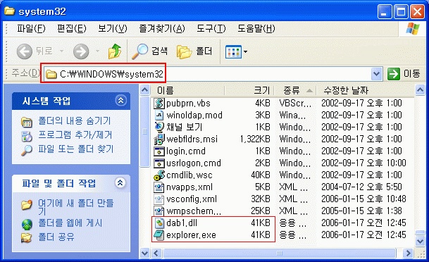 ¶ÇÇÑ ½Ã½ºÅÛÆú´õ¿¡ explorer.exe(41,567 ¹ÙÀÌÆ®)¿Í dab1.dll(41,472 ¹ÙÀÌÆ®) µîÀÇ °ÔÀÓÁ¤º¸ Å»Ãë¿ë ½ÅÁ¾ Æ®·ÎÀ̸ñ¸¶µµ °°ÀÌ ¼³Ä¡µÈ´Ù.