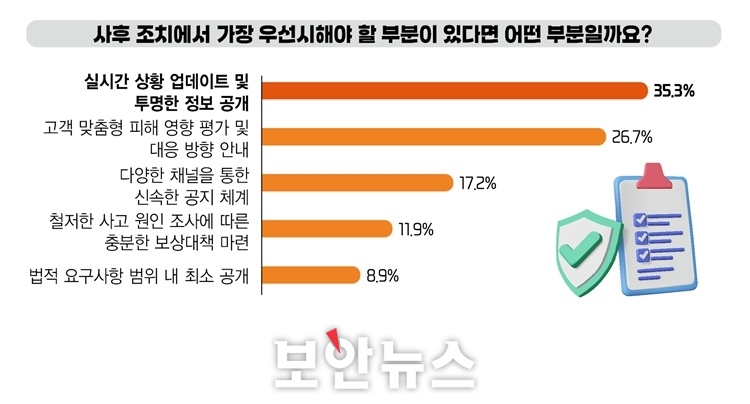 ÀÀ´äÀÚµéÀº ¡®½Ç½Ã°£ »óȲ ¾÷µ¥ÀÌÆ® ¹× Åõ¸íÇÑ Á¤º¸ °ø°³¡¯°¡ 35.3%·Î °¡Àå Áß¿äÇÏ´Ù°í ÀÀ´äÇß´Ù. ¡®°í°´ ¸ÂÃãÇü ÇÇÇØ ¿µÇâ Æò°¡ ¹× ´ëÀÀ ¹æÇ⠾ȳ»¡¯°¡ 26.7%, ¡®´Ù¾çÇÑ Ã¤³ÎÀ» ÅëÇÑ ½Å¼ÓÇÑ °øÁö ü°è¡¯´Â 17.2%, ¡®Ã¶ÀúÇÑ »ç°í ¿øÀÎ Á¶»ç¿¡ µû¸¥ ÃæºÐÇÑ º¸»ó´ëÃ¥ ¸¶·Ã¡¯ÀÌ 11.9%¸¦ Â÷ÁöÇÏ¸ç µÚ¸¦ À̾ú´Ù. ´ë´Ù¼ö ÀÀ´äÀÌ ±â¾÷ÀÇ Àû±ØÀûÀÎ ´ëó¸¦ ±â´ëÇß´Ù.