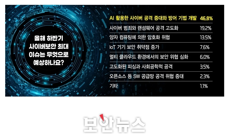 ¿ÃÇØ ÇϹݱ⠻çÀ̹öº¸¾È ÃÖ´ë À̽´´Â ´Ü¿¬ AI¿´´Ù. ¡®AI Ȱ¿ëÇÑ »çÀ̹ö °ø°Ý Áõ´ë¿Í ¹æ¾î ±â¹ý °³¹ß¡¯ÀÌ 46.8%·Î Àý¹Ý¿¡ °¡±î¿î ÀÀ´äÀÚµéÀÇ ¼±ÅÃÀ» ¹Þ¾Ò´Ù. ÀÌ´Â ÃÖ±Ù AI »ê¾÷ÀÌ º»°ÝÈ­µÇ°í, AI ¿¡ÀÌÀüÆ® µî ´Ùä·Î¿î Ȱ¿ë¹ýÀÌ µîÀåÇϸ鼭 ¾ÈÀüÇÑ AI Ȱ¿ëÀ» ´ãº¸ÇÏ´Â µ¥ÀÌÅÍ º¸¾È°ú AI¸¦ ÀÀ¿ëÇÑ »õ·Î¿î º¸¾È ±â¹ýÀÌ ¸¹Àº °ü½ÉÀ» ¹Þ´Â µ¥ µû¸¥ °ÍÀ¸·Î º¸ÀδÙ.