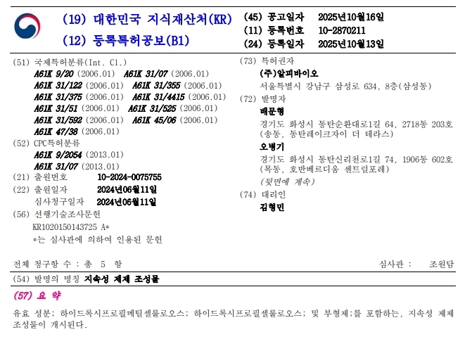 ÀǾàǰ ¹× °Ç°±â´É½Äǰ ¿¬±¸°³¹ß»ý»ê(CDMO) Àü¹®±â¾÷ ¾ËÇǹÙÀÌ¿À´Â À¯È¿ ¼ººÐÀÇ ¾ÈÁ¤¼ºÀ» ³ôÀ̰í ÃÖ´ë 12½Ã°£ µ¿¾È Áö¼Ó ¹æÃâÀÌ °¡´ÉÇÑ ¡®Áö¼Ó¼º Á¦Á¦ Á¶¼º¹°¡¯¿¡ ´ëÇÑ Æ¯Çã µî·ÏÀ» ¿Ï·áÇß´Ù°í ¹àÇû´Ù.