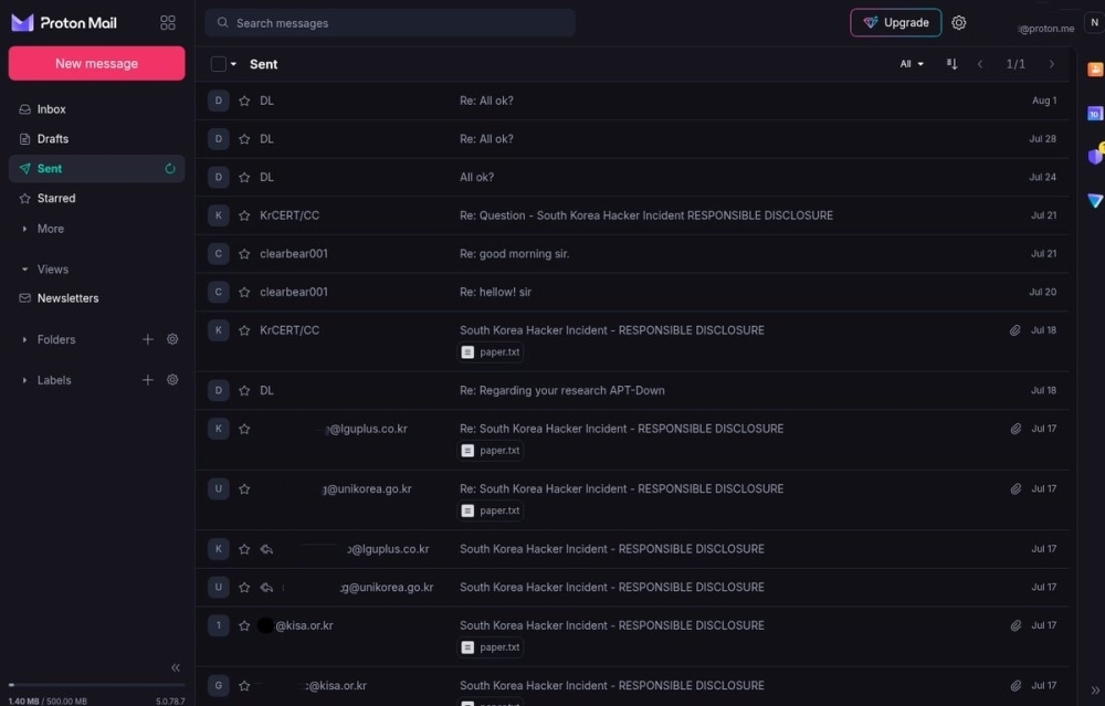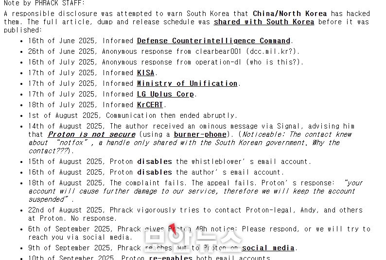 º¸°í¼ ÀúÀÚÀÎ ÈÀÌÆ®ÇØÄ¿ ¡®¼¼À̹ö¡¯(Saber)¿Í ¡®»çÀ̺¸±×¡¯(cyb0rg)´Â 6¿ù 16ÀÏ ¹æÃ¸»ç¿¡ ¡®±è¼öŰ¡¯ ÃßÁ¤ ÇØÄ¿·ÎºÎÅÍ ¹æÃ¸»ç°¡ °ø°Ý´çÇß´Ù´Â »ç½ÇÀ» ¾Ë·È´Ù. À̾î 7¿ù 17ÀÏ Çѱ¹ÀÎÅͳÝÁøÈï¿ø(KISA)°ú ÅëÀϺÎ, LGÀ¯Ç÷¯½º¿¡µµ Á÷Á¢ À̸ÞÀÏ·Î ¿¬¶ôÇØ ¾Ë·È´Ù. 7¿ù 18ÀÏ¿£ KISA Ä§ÇØ»ç°í´ëÀÀÆÀ(KrCERT/CC)¿¡µµ °°Àº ³»¿ëÀÇ À̸ÞÀÏÀ» º¸³Â´Ù.