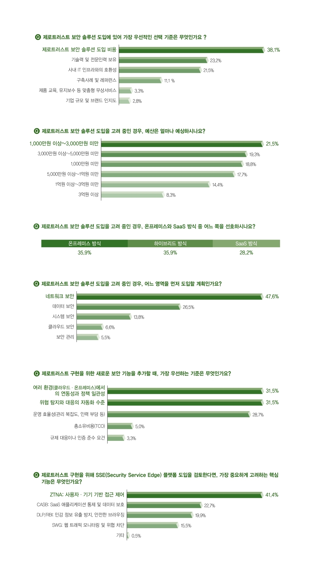 ÀÀ´äÀÚµéÀº Á¦·ÎÆ®·¯½ºÆ® º¸¾È ¼Ö·ç¼Ç µµÀÔ¿¡ À־ ¾î¶² ±âÁØÀ» °¡Àå ¿ì¼±ÇÒ±î? 38.1%´Â ¡®Á¦·ÎÆ®·¯½ºÆ® º¸¾È ¼Ö·ç¼Ç µµÀÔ ºñ¿ë¡¯À» ¼±ÅÃÇØ ¿ª½Ã³ª ºñ¿ëÀÌ °¡Àå Å« ¹®Á¦¶ó°í ´äÇß´Ù. À̾î 23.2%´Â ¡®±â¼ú·Â ¹× Àü¹® Àη º¸À¯¡¯¸¦, 21.5%´Â ¡®»ç³» IT ÀÎÇÁ¶ó¿ÍÀÇ È£È¯¼º¡¯À» ²Å¾Ò´Ù.
