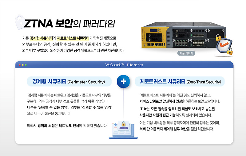 ¡®WeGuardia¢â ITUz¡¯´Â ¡°¹«¾ùµµ ½Å·ÚÇÏÁö ¾Ê°í, ¸ðµç ¿¬°áÀ» °ËÁõÇÑ´Ù¡±¶ó´Â Á¦·ÎÆ®·¯½ºÆ® ¿øÄ¢À» ±â¹ÝÀ¸·Î ¼³°èµÆ´Ù. ±âÁ¸ÀÇ °æ°èÇü º¸¾È(Perimeter Security)ÀÌ ¿ÜºÎ¿Í ³»ºÎ¸¦ ±¸ºÐÇÏ´Â ¹æ½ÄÀ̾ú´Ù¸é, ITUz´Â ¼­ºñ½º ´ÜÀ§ÀÇ ¼¼ºÐÈ­µÈ Á¢±ÙÁ¦¾î¸¦ ÅëÇØ ¾ÖÇø®ÄÉÀ̼Ǻ°¡¤»ç¿ëÀÚº° ÃÖ¼Ò ±ÇÇÑ ¿øÄ¢À» Àû¿ëÇÑ´Ù. À̸¦ ÅëÇØ ¼­¹ö °£ Æ®·¡ÇÈ ¾Ïȣȭ, »ç¿ëÀÚ ½ÂÀÎ ±â¹Ý Åͳθµ, Á¤Ã¥ ±â¹Ý Á¢±ÙÁ¦¾î¸¦ ±¸ÇöÇØ ±â¾÷ ³»ºÎ À̵¿ À§Çù(Lateral Movement)À» ±Ùº»ÀûÀ¸·Î Â÷´ÜÇÑ´Ù.
