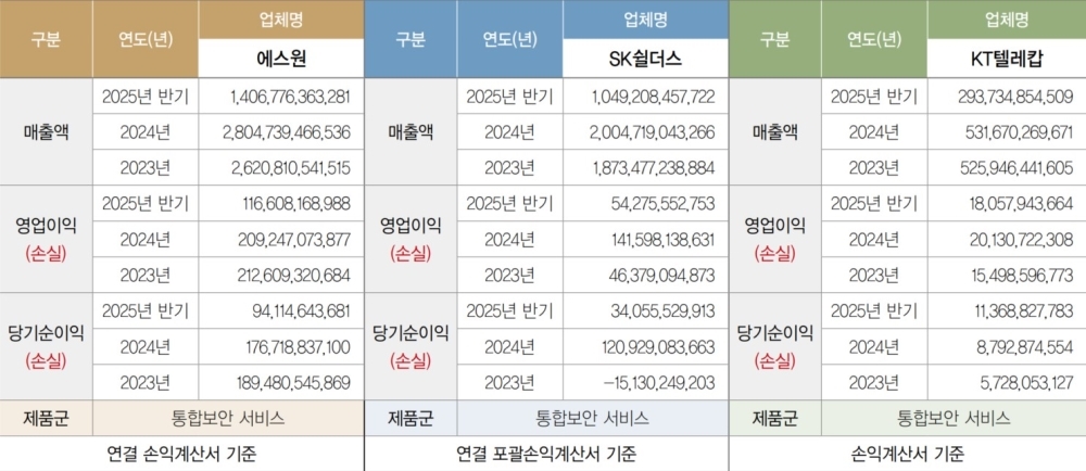 ÅëÇÕº¸¾È 3»ç(¿¡½º¿ø, SK½¯´õ½º, KTÅÚ·¹Ä°)ÀÇ È帧Àº »ó´ëÀûÀ¸·Î ¾ÈÁ¤ÀûÀ̾ú´Ù. ¿¡½º¿øÀº ÀÎÇÁ¶ó °ü¸®¿Í AI °üÁ¦¸¦ °áÇÕÇÑ ¼­ºñ½ºÇü º¸¾È ¸ðµ¨·Î °ßÁ¶ÇÑ ¼öÀÍÀ» À¯ÁöÇß°í, SK½¯´õ½º´Â ¹°¸®¡¤»çÀ̹ö À¶ÇÕº¸¾È Ç÷§ÆûÀ» È®´ëÇÏ¸ç ¸ÅÃ⠱Ը𸦠Ű¿ü´Ù. KTÅÚ·¹Ä°Àº ±¸µ¶Çü ¿µ»óº¸¾È ¡®GiGAeyes¡¯¿Í »ýȰ¾ÈÀü¡¤µ¹º½ ¼­ºñ½º¸¦ °áÇÕÇØ ½ÃÀåÀ» ´Ùº¯È­Çß´Ù. »ê¾÷ Àü¹ÝÀÌ À§ÃàµÈ °¡¿îµ¥, ÀÌ ¼¼ ȸ»ç´Â ¡®º¸¾ÈÀ» ¿î¿µÇÏ´Â »ç¾÷¡¯À¸·Î ¹æÇâÀ» ¸íÈ®È÷ ÀâÀº ¼ÀÀÌ´Ù.