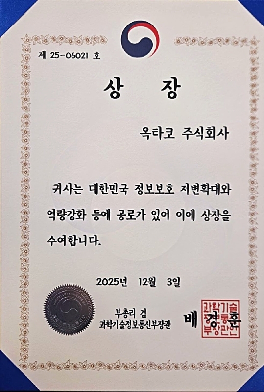 [º¸¾È´º½º Á¶ÀçÈ£ ±âÀÚ] ÀÎÁõ º¸¾È Àü¹® ±â¾÷ ¿ÁŸÄÚ°¡ ´ëÇѹα¹ Á¤º¸º¸È£ »ê¾÷ ¹ßÀü°ú º¸¾È ¿ª·® °­È­¿¡ ±â¿©ÇÑ °ø·Î¸¦ ÀÎÁ¤¹Þ¾Ò´Ù.