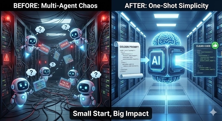 ¾Õ¼± ½ÇÆÐ¸¦ °è±â·Î º¹ÀâÇÑ ¿¡ÀÌÀüÆ®¸¦ ¸ðµÎ Æó±âÇÏ°í ¡®¿ø¼¦ ÄÁÅØ½ºÆ®¡¯ Àü·«À¸·Î ¼±È¸Çß´Ù. º¹ÀâÇÑ Ãß·Ð °úÁ¤À» ÇϳªÀÇ ¡®°ñµç ÇÁ·ÒÇÁÆ®¡¯(Golden Prompt)¿¡ ´ã¾Æ LLM¿¡ ÇÑ ¹ø¿¡ ¹¯´Â ¹æ½ÄÀÌ´Ù.