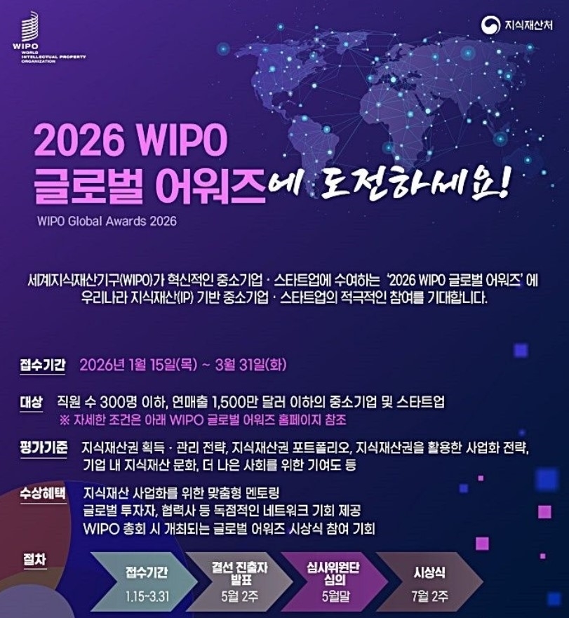 Áö½ÄÀç»êó´Â 15ÀϺÎÅÍ Áö½ÄÀç»ê ±â¹Ý Áß¼Ò±â¾÷¡¤½ºÅ¸Æ®¾÷À» ´ë»óÀ¸·Î, ¼¼°èÁö½ÄÀç»ê±â±¸(WIPO) ¡®2026 ±Û·Î¹ú ¾î¿öÁ(Global Awards) ½Åû Á¢¼ö¸¦ ½ÃÀÛÇÑ´Ù°í À̳¯ ¹àÇû´Ù.