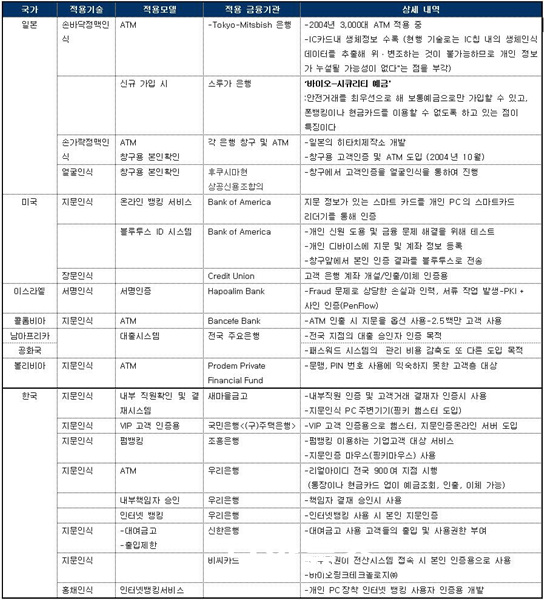 ÇöÀç ½ÅÇÑÀºÇà, »ê¾÷ÀºÇà µî ÀϺΠ±ÝÀ¶±Ç¿¡¼­´Â Áö¹®ÀνĴ뿩±Ý°í¸¦ ¼³Ä¡ÇØ »ç¿ëÀÚ º»ÀÎÀÇ Áö¹®ÀÎÁõÀ» ÅëÇØ¼­¸¸ ´ë¿©±Ý°í »ç¿ëÀÌ °¡´ÉÇϵµ·Ï Á¶Ä¡Çß´Ù. ¶ÇÇÑ ÀϺΠ±ÝÀ¶±Ç°ú 24½Ã ÆíÀÇÁ¡ µî¿¡´Â ºñ¹Ð¹øÈ£, ÅëÀå, µµÀå µîÀ» ÈÞ´ëÇÒ ÇÊ¿ä ¾øÀÌ ÀºÇà°Å·¡°¡ °¡´ÉÇϵµ·Ï Áö¹®ÀÎ½Ä ATMÀ» ±¸ÃàÇÑ »óÅ´Ù. ÀÌ·¯ÇÑ »ýüÀÎ½Ä ±â¼úÀº ÇâÈÄ ´ëºÎºÐ ±ÝÀ¶±Ç¿¡¼­ µµÀÔÇÒ Àü¸ÁÀÌ´Ù.