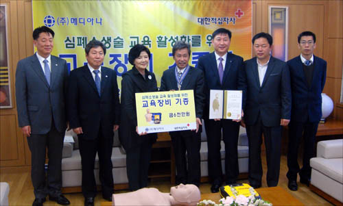 [º¸¾È´º½º ±èÅÂÇü] ÀÇ·á±â±â Àü¹® ¾÷ü ¸Þµð¾Æ³ª(ȸÀå ±æ¹®Á¾)°¡ ´ëÇÑÀû½ÊÀڻ翡 ½ÉÆó¼Ò»ý¼ú ±³À°°úÁ¤À» Áö¿øÇϱâ À§ÇØ ±³À°¿ëÀÚµ¿Á¦¼¼µ¿±â 50´ë¿Í ±³À°¿ë½ÉÆó¼Ò»ý¼ú ¸¶³×Ų 28´ë, ¸Þµð¾Æ³ª HeartOn A10 5´ë µî 6,000¸¸¿ø »ó´çÀÇ Àåºñ¿Í Çö±Ý 300¸¸¿øÀ» Ưº°È¸ºñ·Î ±âÁõÇß´Ù°í ¹àÇû´Ù.