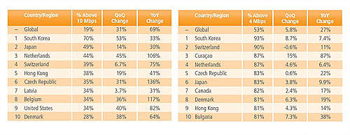 À̹ø ÀÎÅÍ³Ý ÇöȲ º¸°í¼¿¡ µû¸£¸é, Àü¼¼°è ÀÎÅÍ³Ý Æò±Õ Á¢¼Ó ¼Óµµ´Â Áö³ ºÐ±â ´ëºñ 10% Áõ°¡ÇÑ 3.6Mbps¸¦ ±â·ÏÇϸç Áö¼ÓÀûÀÎ »ó½Â¼¼¸¦ À̾´Ù. ƯÈ÷, À̹ø ºÐ±â Çѱ¹Àº 13.3Mbps¿¡¼ Áö³ ºÐ±â ´ëºñ 66% ¿À¸¥ 22.1Mbps¸¦ ±â·ÏÇÏ¸ç »óÀ§ 10°³±¹ Áß ÃÖ´ë Áõ°¡Ä¡¸¦ º¸¿´´Ù. Çѱ¹ÀÇ ÀÌ·¯ÇÑ Æø¹ßÀûÀÎ ¼öÄ¡´Â Áö³ÇØ È®´ëµÈ ¾ÆÄ«¸¶ÀÌ¿Í KTÀÇ ÆÄÆ®³Ê½Ê¿¡¼ ±âÀÎÇÑ °ÍÀ¸·Î ÆÄ¾ÇµÈ´Ù. 2À§¸¦ Â÷ÁöÇÑ ÀϺ»Àº 13.3Mbps¸¦ ±â·ÏÇϸç Çѱ¹°ú 8.8MbpsÀÇ Å« Â÷À̸¦ º¸¿´À¸¸ç, È«Äá°ú ³×´ú¶õµå°¡ 12.5 Mbps, ½ºÀ§½º 11.6Mbps·Î ±× µÚ¸¦ À̾ú´Ù.
