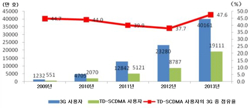 ¡ã 2009³â-2013³â Áß±¹ 3G À̵¿ÀüÈ »ç¿ëÀÚ¿Í TD-SCDMA ¹æ½Ä 3G »ç¿ëÀÚ ¼ö Áõ°¡ »óȲ(Ãâó: Áß±¹ °ø¾÷Á¤º¸ÈºÎ)