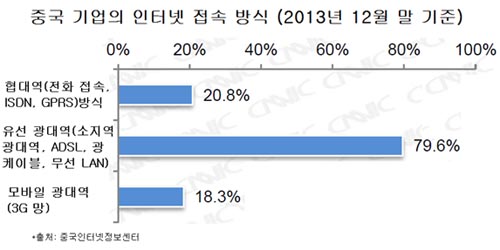 ±¤´ë¿ª ÀÎÅÍ³Ý ÀÌ¿ë »óȲÀ» º¸¸é, Áß±¹ ±â¾÷µéÀÌ °¡Àå ¸¹ÀÌ ¾²´Â ÀÎÅÍ³Ý Á¢¼Ó ¹æ½ÄÀº À¯¼± ±¤´ë¿ª(¼ÒÁö¿ª ±¤´ë¿ª¡¤ADSL¡¤±¤ÄÉÀÌºí¡¤¹«¼± LAN)À¸·Î 79.6%ÀÇ ÀÌ¿ë·üÀ» º¸¿´´Ù. À̾î ÀüÈ Á¢¼Ó(dial-up)°ú ISDN¡¤GPRS µî Çù´ë¿ª Á¢¼Ó ¹æ½ÄÀº 20.8%ÀÇ ºñÁßÀ» º¸¿´´Ù. ¸ð¹ÙÀÏ ±¤´ë¿ª(3G À̵¿Åë½Å¸Á) Á¢¼Ó ¹æ½ÄÀÇ ºñÀ²Àº 18.3%·Î µÚ¸¦ À̾ú´Ù.