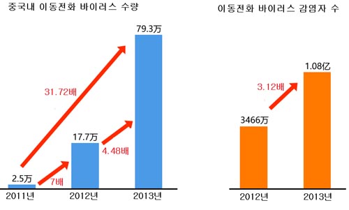 ÅÖ½®ÀÇ ¸ð¹ÙÀÏ º¸¾È ·¦ÀÌ ÀÚü À̵¿ÀüÈ º¸¾È ¼Ö·ç¼Ç(¹é½Å)À» ½á¼ ŽÁöÇÑ À̵¿ÀüÈ ¹ÙÀÌ·¯½º´Â 2011³â 2¸¸5,404°³, 2012³â¿¡´Â 6.98¹è ´Ã¾î³ 17¸¸7,407°³, 2013³â¿¡´Â 2³â Àü º¸´Ù 31¹è ÆøÁõÇÑ 76¸¸3,351°³¿¡ ´ÞÇß´Ù. ÀÌ¾î ¿ÃÇØ µé¾î¼´Â Áö³ 1ºÐ±â¿¡¸¸ 14¸¸3,945°³°¡ ŽÁöµÇ´Â µî Áö¼ÓÀûÀÎ Áõ°¡ È帧À» º¸À̰í ÀÖ´Ù.