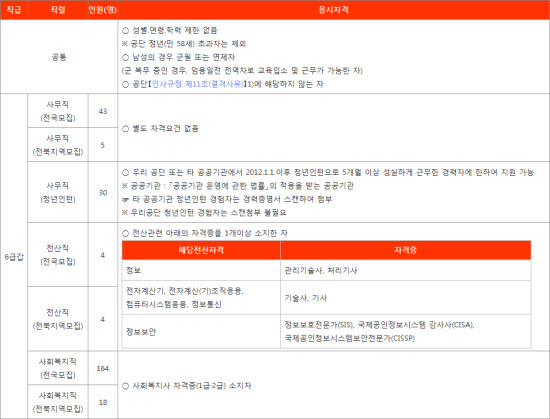 °øÅë ÀÀ½ÃÀÚ°ÝÀº ¼ºº°. ¿¬·É. Çз¿¡ Á¦ÇÑÀÌ ¾øÀ¸³ª °ø´Ü Á¤³â(¸¸ 58¼¼) ÃʰúÀÚ´Â Á¦¿ÜµÈ´Ù. ³²¼ºÀÇ °æ¿ì ±ºÇÊ ¶Ç´Â ¸éÁ¦ÀÚ Áö¿ø °¡´ÉÇϸç, ±º º¹¹« ÁßÀÎ °æ¿ì ÀÓ¿ëÀÏÀü Àü¿ªÀÚ·Î ±³À°ÀÔ¼Ò ¹× ±Ù¹«°¡ °¡´ÉÇÑ ÀÚ¿©¾ß ÇÑ´Ù. ¶ÇÇÑ °ø´Ü ¡®Àλç±ÔÁ¤ Á¦11Á¶(°á°Ý»çÀ¯)¡¯¿¡ ÇØ´çÇÏÁö ¾Ê´Â ÀÚ¸¸ ÀÀ½ÃÀÚ°ÝÀÌ ÁÖ¾îÁø´Ù.