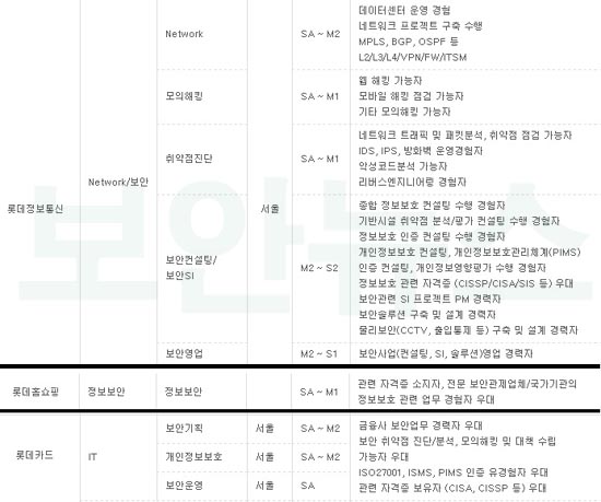 ÀÌ¿¡ ·Ôµ¥Á¤º¸Åë½ÅÀº Network, ¸ðÀÇÇØÅ·, Ãë¾àÁ¡Áø´Ü, º¸¾ÈÄÁ¼³ÆÃ/º¸¾È SI, º¸¾È¿µ¾÷ µî 5°³ºÐ¾ß, ·Ôµ¥È¨¼îÇÎÀº Á¤º¸º¸¾È ºÐ¾ß, ·Ôµ¥Ä«µå´Â º¸¾È±âȹ, °³ÀÎÁ¤º¸º¸È£, º¸¾È¿î¿µ µî 3°³ ºÐ¾ß¿¡¼ ¸ðÁýÇÑ´Ù.