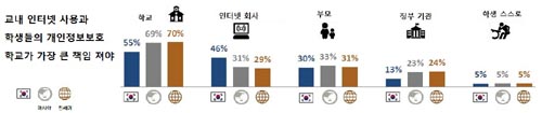 ÇкθðµéÀÇ 70%´Â Çб³°¡ ÇлýµéÀÇ Á¤º¸ À¯Ãâ ¹®Á¦¿¡ Ã¥ÀÓÀ» Á®¾ß µÈ´Ù°í ´äÇÑ ¹Ý¸é, 31%´Â ºÎ¸ð, 29%´Â ÀÎÅÍ³Ý ±â¾÷, 24%´Â Á¤ºÎ¿¡°Ô Ã¥ÀÓÀÌ ÀÖ´Ù°í ´äÇß´Ù. 5%´Â Çлý ½º½º·Î¿¡°Ô Ã¥ÀÓÀÌ ÀÖ´Ù°í ÀÀ´äÇß´Ù.