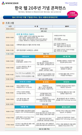 ¶ÇÇÑ, ÀÌ Çà»ç¿¡¼ ¸ðÁú¶ó °øÅë â¾÷ÀÚ¿´À¸¸ç CTO¿´´ø ºê·»´Ü ÀÌÅ©(Brendan eich)¿Í CSSÀÇ Ã¢½ÃÀÚÀ̱⵵ ÇÑ ¿ÀÆä¶óÀÇ CTOÀÎ ÇÏÄÞ ºñ¿ò¸®(Hakon Wium Lie)°¡ Âü¿©ÇÏ¿© Á÷Á¢ ¿¬¼³À» ÁøÇàÇÑ´Ù. ±×¿Ü Àü ±¸±ÛÄÚ¸®¾Æ ´ëÇ¥¿´´ø ¿°µ¿ÈÆ ¾¾ µî ±¹³»¿Ü À¥ ¸®´õµéÀÌ ÇÑÀÚ¸®¿¡ ¸ð¿© Çѱ¹ À¥ 20³â ¿ª»ç¿¡ ´ëÇØ ȸ°íÇØ º¸°í ÇâÈÄ Çѱ¹ À¥ 20³â¿¡ ´ëÇØ ±×·Áº¸´Â ½Ã°£À» °¡Áö°Ô µÈ´Ù.