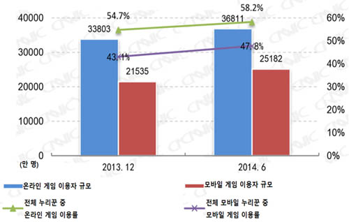 ¡ã 2013³â 12¿ù~2014³â 6¿ù Áß±¹ ¿Â¶óÀΰú ¸ð¹ÙÀÏ »ó °ÔÀÓ ÀÌ¿ëÀÚ ±Ô¸ð¿Í ÀÌ¿ë·ü(Ãâó:Áß±¹ÀÎÅͳÝÁ¤º¸¼¾ÅÍ)