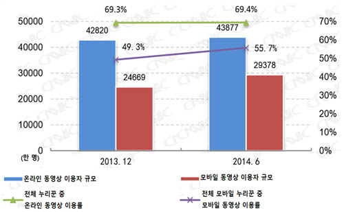 ¡ã 2013³â 12¿ù~2014³â 6¿ù Áß±¹ ¿Â¶óÀΰú ¸ð¹ÙÀÏ »ó µ¿¿µ»ó ÀÌ¿ëÀÚ ±Ô¸ð¿Í ÀÌ¿ë·ü(Ãâó:Áß±¹ÀÎÅͳÝÁ¤º¸¼¾ÅÍ)