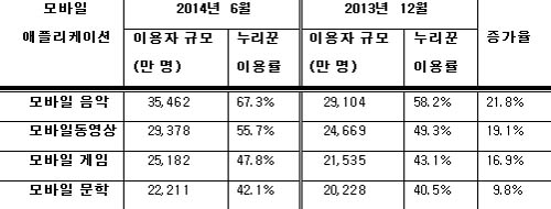 ½º¸¶Æ®±â±â¿¡¼ ¸ð¹ÙÀÏ À½¾ÇÀ» ÀÌ¿ëÇÏ´Â »ç¶÷Àº 6¿ù ¸» ±âÁØ 3¾ï5,462¸¸ ¸íÀ¸·Î ÆÄ¾ÇµÆ´Ù. »ó¹Ý±â µ¿¾È ¾à 6,360¸í ±ÞÁõÇß´Ù. ÀÌ¿¡ ÈûÀÔ¾î Àüü ¸ð¹ÙÀÏ ´©¸®²Û Áß À½¾Ç ÀÌ¿ë·üÀº 67.3%·Î 9.1%p »ó½ÂÇß´Ù.