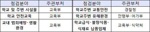 [º¸¾È´º½º ¹Î¼¼¾Æ] Á¤ºÎ°¡ Çб³¿Í ÁÖº¯ ¾ÈÀüÁ¡°Ë¿¡ ´ë´ëÀûÀ¸·Î ³ª¼±´Ù. ¾ÈÀüÇàÁ¤ºÎ(Àå°ü Á¤Á¾¼·)´Â ±³À°ºÎ, ¿©¼º°¡Á·ºÎ, ½ÄǰÀǾàǰ¾ÈÀüó, °æÂûû µî°ú ÇÔ²² 11¿ù ÇÑ´Þ°£ ¡®Çб³ Ưº°¾ÈÀüÁø´Ü¡¯À» ½Ç½ÃÇÑ´Ù.