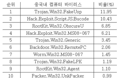 Áö³ ÁÖ ÄÄÇ»ÅÍ ¹ÙÀÌ·¯½º Åé10¿¡´Â ¡âTrojan.Win32.FakeUsp ¡âHack.Exploit.Script.JS.Bucode ¡âRootKit.Win32.ObscureU ¡âHack.Exploit.Win32.MS08-067 ¡âTrojan.Win32.Generic ¡âBackdoor.Win32.RemotePC ¡âWorm.Win32.MS08-067 ¡âTrojan.Win32.FakeLPK ¡âRootKit.Win32.Agent ¡âPacker.Win32.UnkPacker µîÀÇ ¼øÀ¸·Î ³ªÅ¸³µ´Ù.