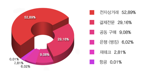 ÀüÀÚ»ó°Å·¡·ù¿¡ ÀÌ¾î ¡®°áÁ¦ Àü¹®(Á¦3ÀÚ °áÁ¦È¸»ç)¡¯·ù ¾ÛÀÇ ´Ù¿î·Îµå°¡ 29.16%ÀÇ ºñÁßÀ¸·Î 2À§¸¦ Â÷ÁöÇß´Ù. ¶Ç ¡®°øµ¿ ±¸¸Å¡¯·ù ¾ÛÀÌ 9.08%ÀÇ Á¡À¯À²À» º¸¿´°í, ¡®ÀºÇà(¹ðÅ·)¡¯·ù ¾ÛÀº 6.02%, ¡®ÀçÅ×Å©¡¯·ù´Â 2.81%, ¡®Ç×°ø¡¯·ù ¾ÛÀº 0.04%ÀÇ ´Ù¿î·Îµå ºñÀ²À» °¢°¢ ±â·ÏÇß´Ù.
