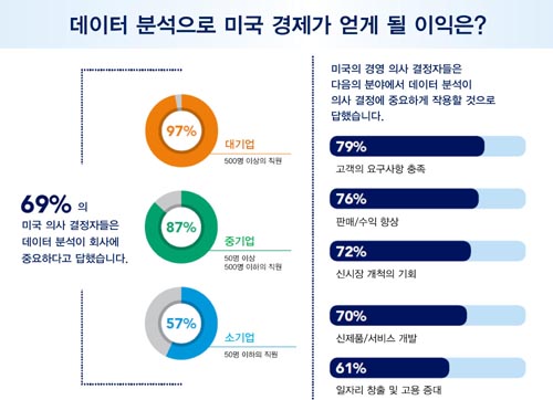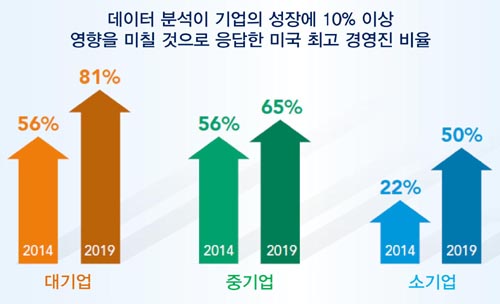 -60%ÀÇ ¼Ò±â¾÷¿¡¼­ µ¥ÀÌÅÍ ºÐ¼®Àº Áß¿äÇÏ°Ô ÀÛ¿ëÇÑ´Ù. ÀÌµé ±â¾÷ÀÇ ÀÇ»ç°áÁ¤ÀÚ¿¡ µû¸£¸é 50¸í ÀÌÇÏÀÇ Á÷¿øÀÌ ±Ù¹«ÇÏ´Â ¹Ì±¹ ±â¾÷ÀÇ 57%¿Í °°Àº ±Ô¸ðÀÇ À¯·´ ±â¾÷ 62%°¡ ÀÌ¿¡ ÇØ´çµÈ´Ù. ¹Ý¸é Áß±â¾÷ ȸ»ç(50¸í ÀÌ»ó, 500¸í ÀÌÇÏÀÇ Á÷¿øÀÌ ±Ù¹«ÇÏ´Â ±â¾÷)ÀÇ °æ¿ì ¹Ì±¹ÀÇ °æ¿µÁø 87%¿Í À¯·´ °æ¿µÁø 79%°¡ µ¥ÀÌÅÍ ºÐ¼®ÀÌ Áß¿äÇÏ´Ù°í ´äÇßÀ¸¸ç, ´ë±â¾÷(500¸í ÀÌ»óÀÇ Á÷¿øÀÌ ±Ù¹«ÇÏ´Â ±â¾÷)¿¡¼­´Â ¹Ì±¹ °æ¿µÁø 97%¿Í À¯·´ °æ¿µÁø 82%°¡ À̰°ÀÌ ´äÇß´Ù.