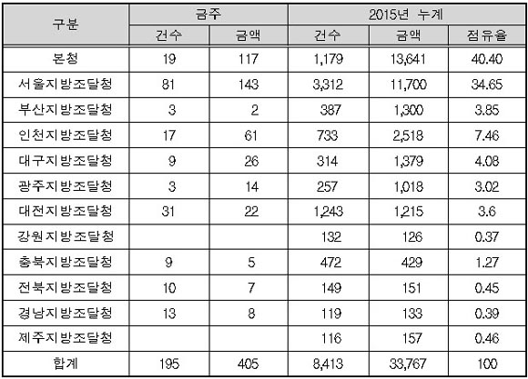 Áö¿ªº° ¹ßÁÖ·®À» º¸¸é ¡â´ëÀü±¤¿ª½Ã ¼ÒÀç º»Ã»ÀÌ 117¾ï¿ø ¡â¼¿ïÁö¹æÃ» 143¾ï¿ø µî 2°³Ã»ÀÌ Àüü ±Ý¾×ÀÇ 64.2%¸¦, ±âŸ ÀÎõ µî 10°³ Áö¹æÃ»ÀÌ 145¾ï¿øÀ» ÁýÇàÇÏ°Ô µÈ´Ù.