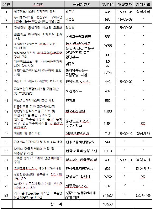ºÐ¾ßº°·Î »ìÆìº¸¸é ¡âÁ¤º¸È »ç¾÷À¸·Î ¡®°³ÀÎÁ¤º¸º¸È£ ¹× »çÀ̹ö ¾ÈÀü°ü¸®Ã¼°è °È»ç¾÷¡¯ µîÀÌ 111°Ç, 248¾ï¿ø ¡âÀϹݿ뿪À¸·Î´Â ¡®³ó¸²Ãà»ê°Ë¿ªº»ºÎ ½Åû»ç ÀÌÀü ÀÌ»ç¿ë¿ª µî 78°Ç, 97¾ï¿ø ¡â°Ç¼³¿ë¿ªÀº ¡¯Ã¢¿øÄÁº¥¼Ç¼¾ÅÍ ÁõÃà°ø»ç °Ç¼³»ç¾÷°ü¸®¿ë¿ª¡¯ µî 6°Ç, 60¾ï¿ø µîÀÌ ÁýÇàµÈ´Ù.