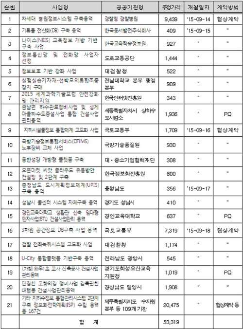 ºÐ¾ßº°·Î »ìÆìº¸¸é ¡âÁ¤º¸È »ç¾÷¿¡ ¡®°æÂûº´¿ø Â÷¼¼´ë º´¿øÁ¤º¸½Ã½ºÅÛ ±¸Ãà ¿ë¿ª¡¯ µîÀÌ 90°Ç, 382¾ï¿ø ¡âÀϹݿ뿪¿¡´Â ¡®2015 ¼¼°è °úÇбâ¼ú Æ÷·³ ¾ÈÀü°È ¹× °ü¸®Áö¿ø»ç¾÷¡¯ µî 86°Ç, 82¾ï¿ø ¡â°Ç¼³¿ë¿ªÀ¸·Î´Â ¡®Çϼö°ü·Î Á¤ºñ»ç¾÷ ¹× Çϼöµµ Áõ¼³»ç¾÷ ÅëÇհǼ³°ü¸® ¿ë¿ª¡¯ µî 11°Ç, 69¾ï¿øÀÌ ÁýÇàµÈ´Ù.