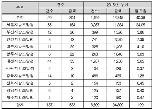 Áö¿ªº° ¹ßÁÖ·®À» º¸¸é ¡â´ëÀü±¤¿ª½Ã ¼ÒÀç º»Ã»ÀÌ 204¾ï¿ø ¡â¼¿ïÁö¹æÃ» 184¾ï¿ø µî 2°³Ã»ÀÌ Àüü ±Ý¾×ÀÇ 72.8%¸¦, ±âŸ ºÎ»ê µî 10°³ Áö¹æÃ»ÀÌ 145¾ï¿øÀ» °¢°¢ ÁýÇàÇÏ°Ô µÈ´Ù.