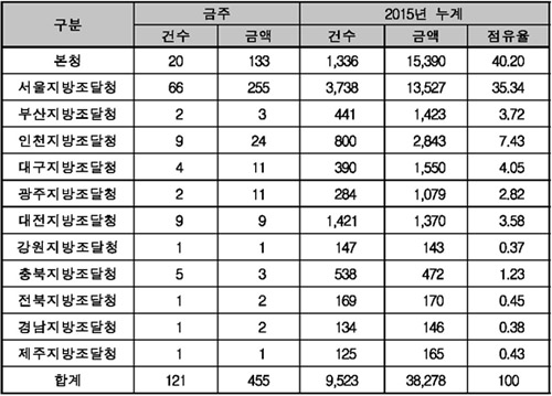 Áö¿ªº° ¹ßÁÖ·®À» º¸¸é ¡â´ëÀü±¤¿ª½Ã ¼ÒÀç º»Ã»ÀÌ 133¾ï¿ø ¡â¼¿ïÁö¹æÃ» 255¾ï¿ø ¡âÀÎõÁö¹æÃ» µî 2°³Ã»ÀÌ Àüü ±Ý¾×ÀÇ 85.2%¸¦, ±âŸ ºÎ»ê µî 10°³ Áö¹æÃ»ÀÌ 67¾ï¿øÀ» °¢°¢ ÁýÇàÇÏ°Ô µÈ´Ù.