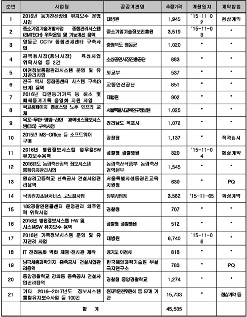 ¡â2016³â µî±âÀü»êÀåºñ À¯Áöº¸¼ö ¿î¿µ »ç¾÷(´ë¹ý¿ø, 19¾ï 4,500¸¸¿ø) ¡âÁß¼Ò±â¾÷±â¼ú°³¹ß»ç¾÷ Á¾ÇÕ°ü¸®½Ã½ºÅÛ(SMTECH) À§Å¹¿î¿µ ¹× ±â´É°³¼± ¿ë¿ª(Áß¼Ò±â¾÷±â¼úÁ¤º¸ÁøÈï¿ø,35¾ï 1,900¸¸¿ø) ¡â¿µµ¿±º CCTV ÅëÇÕ°üÁ¦¼¾ÅÍ ±¸Ãà»ç¾÷(ÃæºÏ ¿µµ¿±º, 10¾ï 2,000¸¸¿ø) ¡â°ñ¸ñÇü½ÃÀå(¿ë³²½ÃÀå) À°¼º»ç¾÷ À§Å¹»ç¾÷ µî 2°Ç(¼Ò»ó°øÀνÃÀåÁøÈï°ø´Ü, 8¾ï 8,300¸¸¿ø) ¡â¿©±ÇÁ¤º¸ÅëÇÕ°ü¸®½Ã½ºÅÛ ¿î¿µ ¹× À¯Áö°ü¸®»ç¾÷(¿Ü±³ºÎ, 5¾ï 3,700¸¸¿ø) ¡âÀü±¹ Åýà ÅëÇÕÄݼ¾ÅÍ ½Ã½ºÅÛ ±¸Ãà(3´Ü°è) ¿ë¿ª(±³Åë¾ÈÀü°ø´Ü, 8¾ï 5,100¸¸¿ø) ¡â2016³â ´Ù¸éµî±â±â·Ï µî ÇØ¼Ò ¹× Æó¼âµî±â±â·Ï À½¿µÈ Áö¿ø »ç¾÷(´ë¹ý¿ø, 9¾ï 200¸¸¿ø) ¡âÇб³È¨ÆäÀÌÁö À¥È£½ºÆÃ ³ëÈÄ ÀÎÇÁ¶ó ±³Ã¼(¼¿ïƯº°½Ã±³À°¿¬±¸Á¤º¸¿ø, 10¾ï 2,500¸¸¿ø) ¡â¸ñÆ÷-¹«¾È-¿µ¾Ï-½Å¾È ±¤¿ª¹ö½ºÁ¤º¸½Ã½ºÅÛ(BIS) ±¸Ãà»ç¾÷(Àü¶ó³²µµ ¸ñÆ÷½Ã, 10¾ï 7,200¸¸¿ø) ¡â2015³â MS-Office µî ¼ÒÇÁÆ®¿þ¾î ±¸¸Å(°æÂûû, 11¾ï 3,700¸¸¿ø) ¡â2016³â º´¿øÁ¤º¸½Ã½ºÅÛ ¾÷¹«¿ëSW À¯Áöº¸¼ö¿ë¿ª(°æÂûû °æÂûº´¿ø, 3¾ï 2,000¸¸¿ø) ¡â2016³âµµ ³ó¸²Ãà»ê°Ë¿ª Á¤º¸½Ã½ºÅÛ ÅëÇÕÀ¯Áö°ü¸®»ç¾÷(³ó¸²Ãà»ê½ÄǰºÎ ³ó¸²Ãà»ê°Ë¿ªº»ºÎ, 15¾ï 4,500¸¸¿ø) ¡â¿Õ½Ê¸®°íµîÇб³ ½ÅÃà°ø»ç °Ç¼³»ç¾÷°ü¸®¿ë¿ª(¼¿ïƯº°½Ã¼ºµ¿±¤Áø±³À°Áö¿øÃ», 6¾ï 3,000¸¸¿ø) ¡â±¹¹æÀüÀÚÁ¶´Þ¼ºñ½º °íµµÈ»ç¾÷(¹æÀ§»ç¾÷û, 35¾ï 8,200¸¸¿ø) ¡â182°æÂû¹Î¿øÄݼ¾ÅÍ ¿î¿µ°ü¸® ¿ÜÁÖÀη À§Å¹»ç¾÷(°æÂûû, 7¾ï 700¸¸¿ø) ¡â2016³â º´¿øÁ¤º¸½Ã½ºÅÛ HW ¹× ½Ã½ºÅÛSW À¯Áöº¸¼ö ¿ë¿ª(°æÂûû °æÂûº´¿ø, 5¾ï 1,200¸¸¿ø) ¡â2016³â °¡Á·Á¤º¸½Ã½ºÅÛ ¿î¿µ ¹× À¯Áö°ü¸® »ç¾÷(´ë¹ý¿ø, 67¾ï 4,000¸¸¿ø ¡âIT Àü·¡µ¿È º®È üÇ衤Àü½Ã°ü Á¦ÀÛ(°æ±âµµ ÀÌõ½Ã, 8¾ï 1,800¸¸¿ø) ¡â³²±Ø¼¼Á¾°úÇбâÁö ÁõÃà°ø»ç °Ç¼³»ç¾÷°ü¸®¿ë¿ª(Çѱ¹Çؾç°úÇбâ¼ú¿ø ºÎ¼³ ±ØÁö¿¬±¸¼Ò, 7¾ï 8,300¸¸¿ø) ¡âÁß¾Ó°æÂûÇб³ °Àǵ¿ ÁõÃà°ø»ç °Ç¼³»ç¾÷°ü¸®¿ë¿ª(°æÂûû Áß¾Ó°æÂûÇб³, 12¾ï 7,400¸¸¿ø) ¡â±âŸ 2016~2017³âµµ Á¤º¸½Ã½ºÅÛ ÅëÇÕÀ¯Áöº¸¼ö»ç¾÷ µî 100°Ç(¿øÀڷ¾ÈÀüÀ§¿øÈ¸ µî 57°³ ±â°ü, 157¾ï 3,300¸¸¿ø)