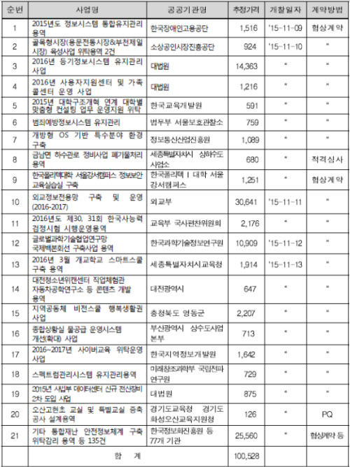 ¡â2015³âµµ Á¤º¸½Ã½ºÅÛ ÅëÇÕÀ¯Áö°ü¸® ¿ë¿ª(Çѱ¹Àå¾ÖÀΰí¿ë°ø´Ü, 15¾ï 1,600¸¸¿ø) ¡â°ñ¸ñÇü½ÃÀå(¿ë¹®ÀüÅë½ÃÀå&ºÎõÁ¦ÀϽÃÀå) À°¼º»ç¾÷ À§Å¹¿ë¿ª 2°Ç(¼Ò»ó°øÀνÃÀåÁøÈï°ø´Ü, 9¾ï 2,400¸¸¿ø) ¡â2016³â µî±âÁ¤º¸½Ã½ºÅÛ À¯Áö°ü¸® »ç¾÷(´ë¹ý¿ø, 143¾ï 6,300¸¸¿ø) ¡â2016³â »ç¿ëÀÚÁö¿ø¼¾ÅÍ ¹× °¡Á·Äݼ¾ÅÍ ¿î¿µ »ç¾÷(´ë¹ý¿ø, 12¾ï 1,600¸¸¿ø) ¡â2015³â ´ëÇб¸Á¶°³Çõ ¿¬°è ´ëÇк° ¸ÂÃãÇü ÄÁ¼³ÆÃ ¾÷¹« ¿î¿µÁö¿ø À§Å¹(Çѱ¹±³À°°³¹ß¿ø, 5¾ï 9,100¸¸¿ø) ¡â¹üÁË¿¹¹æÁ¤º¸½Ã½ºÅÛ À¯Áö°ü¸®(¹ý¹«ºÎ ¼¿ïº¸È£°üÂû¼Ò, 7¾ï 5,900¸¸¿ø) ¡â°³¹æÇü OS ±â¹Ý Ư¼öºÐ¾ß ȯ°æ ±¸Ãà(Á¤º¸Åë½Å»ê¾÷ÁøÈï¿ø, 10¾ï 8,900¸¸¿ø) ¡â±Ý³²¸é Çϼö°ü·Î Á¤ºñ»ç¾÷ Æó±â¹°Ã³¸®¿ë¿ª(¼¼Á¾Æ¯º°ÀÚÄ¡½Ã »óÇϼöµµ»ç¾÷¼Ò, 6¾ï 8,000¸¸¿ø) ¡âÇѱ¹Æú¸®ÅØ´ëÇÐ ¼¿ï°¼Ä·ÆÛ½º Á¤º¸º¸¾È ±³À°½Ç½À½Ç ±¸Ãà(Çѱ¹Æú¸®ÅØ I ´ëÇÐ ¼¿ï°¼Ä·ÆÛ½º, 12¾ï 5,100¸¸¿ø) ¡â2016-2017³â ¿Ü±³Á¤º¸Àü¿ë¸Á ±¸Ãà ¹× ¿î¿µ(¿Ü±³ºÎ, 306¾ï 4,100¸¸¿ø) ¡â2016³âµµ Á¦30, 31ȸ Çѱ¹»ç´É·Â°ËÁ¤½ÃÇè ½ÃÇà¿î¿µ¿ë¿ª(±³À°ºÎ ±¹»çÆíÂùÀ§¿øÈ¸, 21¾ï 7,600¸¸¿ø) ¡â±Û·Î¹ú°úÇбâ¼úÇù¾÷¿¬±¸¸Á ±¹Á¦¹éº»È¸¼± ±¸Ãà»ç¾÷ ¿ë¿ª(Çѱ¹°úÇбâ¼úÁ¤º¸¿¬±¸¿ø, 109¾ï 900¸¸¿ø) ¡â2016³â 3¿ù °³±³Çб³ ½º¸¶Æ®½ºÄ𠱸Ãà ¿ë¿ª(¼¼Á¾Æ¯º°ÀÚÄ¡½Ã±³À°Ã», 19¾ï 1,400¸¸¿ø) ¡â´ëÀüû¼Ò³âÀ§Äµ¼¾ÅÍ Á÷¾÷üÇè°ü ÀÚµ¿Â÷°øÇבּ¸¼Ò µî ÄÜÅÙÃ÷ °³¹ß ¿ë¿ª(´ëÀü±¤¿ª½Ã, 6¾ï 4,700¸¸¿ø) ¡âÁö¿ª°øµ¿Ã¼ ºñÀü½ºÄð Çູ»ýȰ±Ç »ç¾÷(ÃæÃ»ºÏµµ ¿µµ¿±º, 22¾ï 700¸¸¿ø) ¡âÁ¾ÇÕ»óȲ½Ç ¹°°ø±Þ ¿î¿µ½Ã½ºÅÛ °³¼±(È®´ë) »ç¾÷(ºÎ»ê±¤¿ª½Ã »ó¼öµµ»ç¾÷º»ºÎ, 7¾ï 1,300¸¸¿ø) ¡â2016~2017³â »çÀ̹ö±³À° À§Å¹¿î¿µ »ç¾÷(Çѱ¹Áö¿ªÁ¤º¸°³¹ß¿ø, 16¾ï 4,200¸¸¿ø) ¡â½ºÆåÆ®·³°ü¸®½Ã½ºÅÛ À¯Áö°ü¸®¿ë¿ª(¹Ì·¡Ã¢Á¶°úÇкΠ±¹¸³ÀüÆÄ¿¬±¸¿ø, 7¾ï 2,900¸¸¿ø) ¡â2015³â »ç¹ýºÎ µ¥ÀÌÅͼ¾ÅÍ ½Å±Ô Àü»êÀåºñ 2Â÷ µµÀÔ »ç¾÷(´ë¹ý¿ø, 8¾ï 7,500¸¸¿ø) ¡â¿À»ê°íÇöÃÊ ±³½Ç ¹× Ưº°±³½Ç ÁõÃà°ø»ç ¼³°è¿ë¿ª(°æ±âµµ±³À°Ã» °æ±âµµÈ¼º¿À»ê±³À°Áö¿øÃ», 1¾ï 2,600¸¸¿ø) ¡â±âŸ ÅëÇÕÀç³ ¾ÈÀüÁ¤º¸Ã¼°è ±¸Ãà À§Å¹°¨¸® ¿ë¿ª µî 135°Ç(Çѱ¹Á¤º¸ÈÁøÈï¿ø µî 77°³ ±â°ü, 255¾ï 6,000¸¸¿ø)