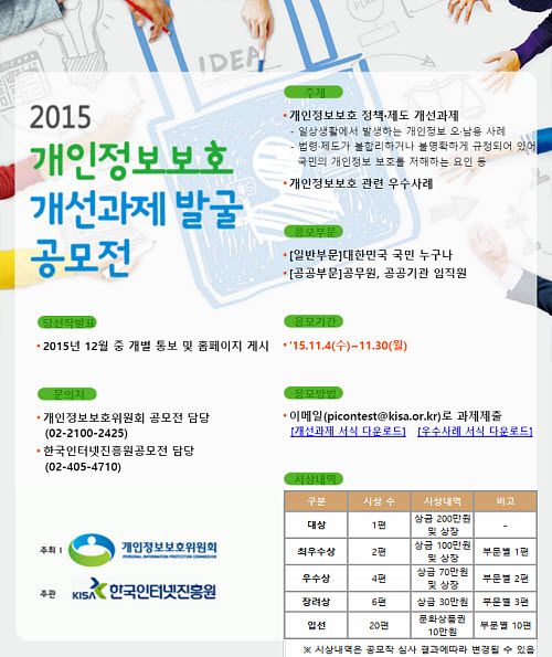 ÀÌ¿Í °ü·ÃÇÑ ¹®ÀÇ»çÇ×Àº °³ÀÎÁ¤º¸º¸È£À§¿øÈ¸ °ø¸ðÀü ´ã´ç(02-2100-2425), Çѱ¹ÀÎÅͳÝÁøÈï¿ø °ø¸ðÀü ´ã´ç(02-405-4710)À¸·Î ¹®ÀÇÇÏ¸é µÈ´Ù.