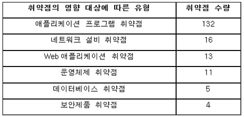±¹°¡ÀÎÅͳÝÀÀ±Þ¼¾ÅͰ¡ ¹ßÇ¥ÇÑ Áö³­ÁÖ 181°³ÀÇ Ãë¾àÁ¡À» ¿µÇâ ´ë»ó¿¡ µû¶ó ³ª´² º¸¸é, ¾ÖÇø®ÄÉÀÌ¼Ç ÇÁ·Î±×·¥ Ãë¾àÁ¡ÀÌ 132°³·Î °¡Àå ¸¹¾Ò´Ù. ÀÌ¾î ³×Æ®¿öÅ© ¼³ºñ Ãë¾àÁ¡ÀÌ 16°³, À¥(Web) ¾ÖÇø®ÄÉÀÌ¼Ç Ãë¾àÁ¡ 13°³, ¿î¿µÃ¼Á¦ Ãë¾àÁ¡Àº 11°³, µ¥ÀÌÅͺ£À̽º Ãë¾àÁ¡ 5°³, º¸¾ÈÁ¦Ç° Ãë¾àÁ¡ 4°³¸¦ °¢°¢ ±â·ÏÇß´Ù.