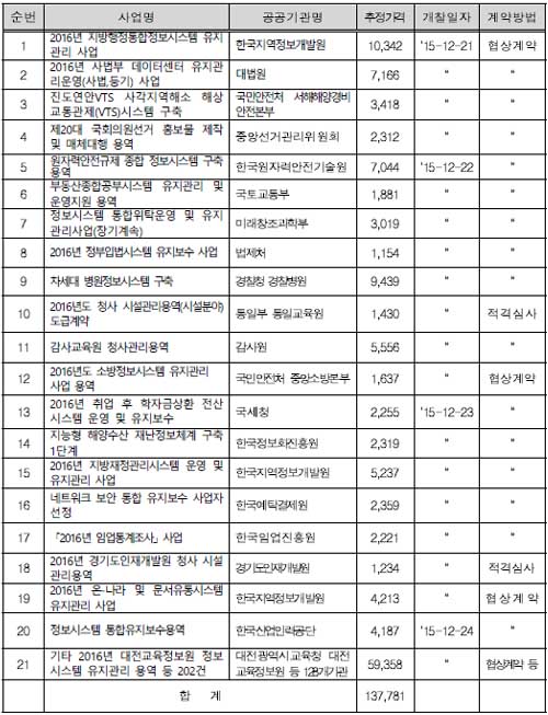 ºÐ¾ßº°·Î »ìÆìº¸¸é ¡âÁ¤º¸È »ç¾÷¿¡´Â ¡®°æÂûº´¿ø Â÷¼¼´ë º´¿øÁ¤º¸½Ã½ºÅÛ ±¸Ãà »ç¾÷(°æÂûû °æÂûº´¿ø, 94¾ï 3,900¸¸¿ø)¡¯, ¡®2016³â Áö¹æ ÇØ¾çÁ¤ÅëÇÕÁ¤º¸½Ã½ºÅÛ À¯Áö°ü¸® »ç¾÷(Çѱ¹Áö¿ª°³¹ß¿ø, 103¾ï 4,200¸¸¿ø)¡¯, ¡®Áøµµ¿¬¾È VTS(ÇØ»ó±³Åë°üÁ¦) »ç°¢Áö¿ªÇØ¼Ò VTS ½Ã½ºÅÛ ±¸Ãà(±¹¹Î¾ÈÀüó ¼ÇØÇØ¾ç°æºñ¾ÈÀüº»ºÎ, 34¾ï 1,800¸¸¿ø)¡¯ µî 142°Ç, 1,052¾ï¿øÀÌ ÁýÇàµÉ ¿¹Á¤ÀÌ´Ù.