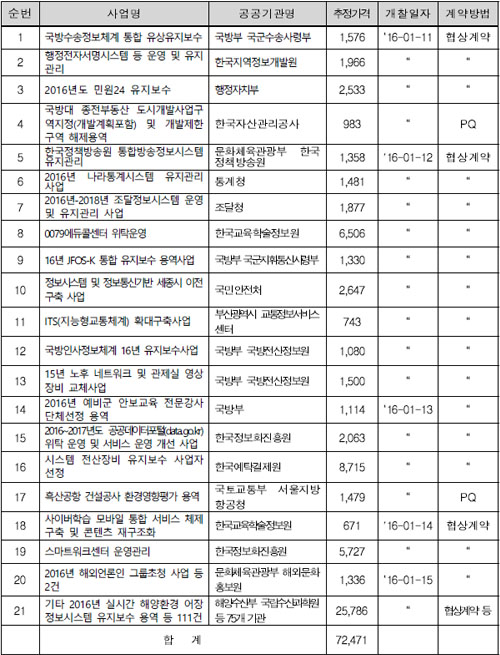 ºÐ¾ßº°·Î »ìÆìº¸¸é ¡âÁ¤º¸È »ç¾÷¿¡´Â ¡®±¹¹Î¾ÈÀüó Á¤º¸½Ã½ºÅÛ ¹× Á¤º¸Åë½Å±â¹Ý ¼¼Á¾½Ã ÀÌÀü ±¸Ãà »ç¾÷(±¹¹Î¾ÈÀüó, 26¾ï 4,700¸¸¿ø)¡¯, ¡®2016³â~2018³â Á¶´ÞÁ¤º¸½Ã½ºÅÛ ¿î¿µ ¹× À¯Áö°ü¸® »ç¾÷(Á¶´Þû, 18¾ï 7,700¸¸¿ø)¡¯, ¡®ITS(Áö´ÉÇü±³Åëü°è) È®´ë ±¸Ãà »ç¾÷(ºÎ»ê±¤¿ª½Ã ±³ÅëÁ¤º¸¼ºñ½º¼¾ÅÍ, 7¾ï 4,300¸¸¿ø)¡¯ µî 85°Ç, 517¾ï¿øÀÌ ÁýÇàµÉ ¿¹Á¤ÀÌ´Ù.