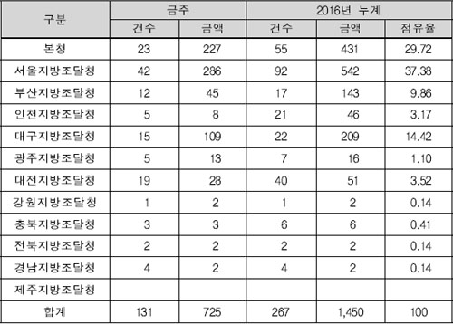 [º¸¾È´º½º ±è¼º¹Ì] Á¶´ÞûÀÌ 1¿ù 11ÀϺÎÅÍ 15ÀϱîÁö ¡®±¹¹Î¾ÈÀüó Á¤º¸½Ã½ºÅÛ ±¸Ãà »ç¾÷¡¯ µî ÃÑ 131°Ç, ¾à 725¾ï¿ø »ó´çÀÇ ½Å±â¼ú¡¤¼ºñ½ººÐ¾ß ¹°Ç° ¹× ¿ë¿ª ÀÔÂûÀ» ½Ç½ÃÇÑ´Ù.