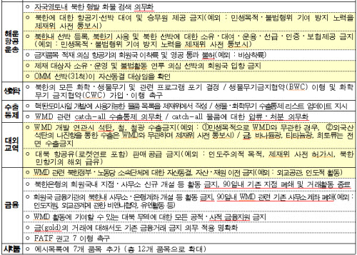 ¿©¼¸Â°, ´ë¿Ü±³¿ªÀº ¡âWMD °³¹ß ¿¬°ü½Ã ¼®Åº, ö, ö±¤ ¼öÃâ±ÝÁö ¡â´ëºÏ Ç×°øÀ¯ ÆÇ¸Å¡¤°ø±Þ ±ÝÁö ¡âWMD °ü·Ã ºÏÇÑÁ¤ºÎ¡¤³ëµ¿´ç ¼Ò¼Ó´Üü¿¡ ´ëÇÑ Àڻ굿°á, ÀڻꡤÀç¿ø ÀÌÀü ±ÝÁö ¡âºÏÇÑÀºÇàÀÇ È¸¿ø±¹³» ÁöÁ¡¡¤»ç¹«¼Ò ½Å±Ô °³¼³ µî Ȱµ¿ ±ÝÁö, 90Àϳ» ±âÁ¸ ÁöÁ¡ Æó¼â ¹× °Å·¡È°µ¿ Á¾·á ¡âȸ¿ø±¹ ±ÝÀ¶±â°üÀÇ ºÏÇѳ» »ç¹«¼Ò¡¤ÀºÇà°èÁ °³¼³ µî Ȱµ¿±ÝÁö, 90Àϳ» WMD °ü·Ã ±âÁ¸ »ç¹«¼Ò¡¤°èÁ Æó¼â ¡âWMD Ȱµ¿¿¡ ±â¿©ÇÒ ¼ö ÀÖ´Â ´ëºÏ ¹«¿ª¿¡ ´ëÇÑ ¸ðµç °øÀû¡¤»çÀû ±ÝÀ¶Áö¿ø ±ÝÁö ¡â±Ý(gold)ÀÇ °Å·¡¿¡ ´ëÇØ¼­µµ ±ÝÀ¶°Å·¡ ±ÝÁö Àǹ« Àû¿ë ¸íȮȭ ¡âFATF ±Ç°í 7 ÀÌÇà Ã˱¸ µîÀÌ °áÀǾȿ¡ Æ÷ÇԵƴÙ.