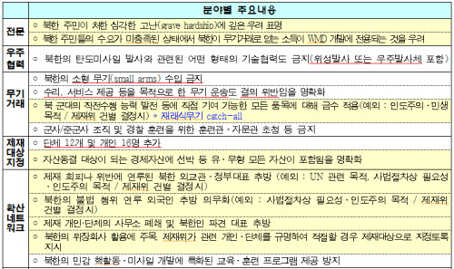 À̹ø ¾Èº¸¸® °áÀÇ´Â ºñ±º»çÀû Á¶Ä¡·Î´Â 70³â À¯¿£ ¿ª»ç»ó Àü·Ê¸¦ ã¾Æº¼ ¼ö ¾øÀ» Á¤µµ·Î °¡Àå °­·ÂÇÏ°í ½ÇÈ¿ÀûÀÎ Á¦Àç °áÀÇÀ̸ç, °ÅÀÇ ¸ðµç Á¶Ç×ÀÌ Àǹ«È­µÇ¾î ÀÖ´Â ¿ª»çÀûÀÎ °áÀǶó´Â Æò°¡´Ù. À̹ø ¾Èº¸¸® °áÀÇ´Â ºÏÇÑÀÇ ´ë·®»ì»ó¹«±â(WMD) °³¹ß¿¡ ´ëÀÀÇÏ´Â °ÍÀº ¹°·Ð WMD Â÷¿øÀ» ³Ñ¾î¼­ ºÏÇÑ °ü·Ã Á¦¹Ý Ãø¸é¿¡ ½É´ëÇÑ ¿µÇâÀ» ÁÙ ¼ö ÀÖ´Â Á¦Àç Á¶Ä¡µéÀÌ Æ÷°ýÀûÀ¸·Î ¸Á¶óµÇ¾î ÀÖ´Ù.