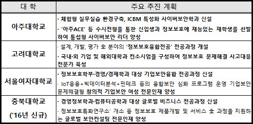 Á¤º¸º¸È£ Ư¼ºÈ´ëÇÐÀº Á¤º¸º¸È£ ¿ì¼ö Àη¾缺À» À§ÇØ Á¤±Ô´ëÇÐÀ» ¼±Á¤ÇØ ¿¬°£ 5¾ï ¿ø¾¿ Ä¿¸®Å§·³ °³¹ß, ÀÎÇÁ¶ó ±¸Ãà, »êÇÐÀü¹®±³¼ö ä¿ë µî¿¡ ´ëÇØ 4+2³â°£ Áö¿øÇÏ´Â »ç¾÷ÀÌ´Ù.