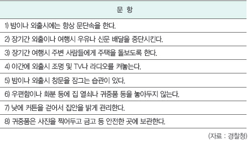 Àú³á¿¡ Àá±ñ ¿ÜÃâÇÒ ¶§´Â ÁýÀÌ ºñ¾îÀÖ´Ù´Â °ÍÀ» ¼û±â±â À§ÇØ Á¶¸íÀ̳ª TV, ¶óµð¿À¸¦ Äѵδ °ÍÀÌ ¾ÈÀüÇÏ´Ù. ¿ÜÃâÇÒ ¶§»Ó¸¸ ¾Æ´Ï¶ó ¹ã¿¡´Â â¹®À» ²À Àá±×´Â ½À°üÀ» °¡Áú Çʿ䵵 ÀÖ´Ù. ¸¸¾à ¿¼è·Î ¿©´Â Çö°ü¹®À̶ó¸é À§¿¡ ¾ð±ÞÇÑ °Íó·³ ¿¼è º¸°ü¿¡µµ ÁÖÀǸ¦ ±â¿ï¿©¾ß ÇÑ´Ù. Çö±ÝÀ̳ª ±ÍÁßǰÀº ±Ý°í¸¦ ¸¶·ÃÇØ º¸°üÇÏ´Â °Íµµ ÁÁ´Ù. Ȥ½Ã³ª Áý¿¡ µµµÏÀÌ µé´õ¶óµµ Áß¿äÇÑ ¹°°ÇÀ» µµµÏ¸ÂÀ» °¡´É¼ºÀÌ Áٱ⠶§¹®ÀÌ´Ù.