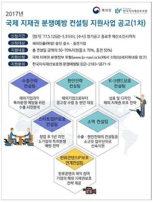 ÄÁ¼³ÆÃ Áö¿øÀº 31ÀϱîÁö ±â¾÷ ½ÅûÀ» ¹Þ¾Æ ÁøÇàµÈ´Ù. »ç¾÷°ø°í¹® ¹× ¼¼ºÎ »çÇ×Àº ±¹Á¦ ÁöÀç±Ç ºÐÀï Á¤º¸ Æ÷ÅÐ(IP-NAVI, www.ip-navi.or.kr)¿¡¼ È®ÀÎÇÒ ¼ö ÀÖ´Ù.