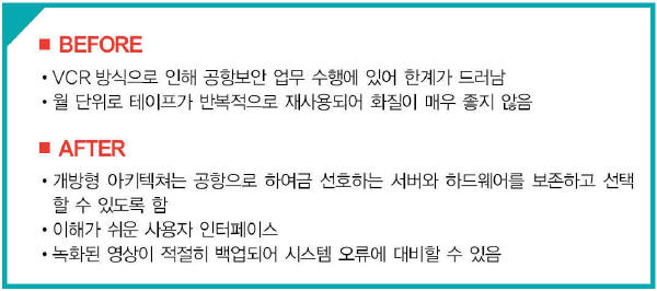 ÀÌ·¯ÇÑ Å« ±Ô¸ðÀÇ °øÇ׿¡¼´Â »ç°Ç¿¡ ´ëÇÑ ´ëÀÀ½Ã°£ÀÌ °øÇ× Á÷¿ø°ú ½Â°´µéÀÇ ¾ÈÀü º¸Àå¿¡ ÀÖ¾î Àý´ëÀûÀ¸·Î Áß¿äÇÏ´Ù. º¸¾È°ü·Ã ¹®Á¦µéÀ» °¨½ÃÇϱâ À§ÇØ »÷Æ÷µå ±¹Á¦°øÇ׿¡¼´Â º¸´Ù ¿À·¡µÈ »ó¾÷ µî±ÞÀÇ ¾Æ³¯·Î±× CCTV ½Ã½ºÅÛÀ» ÀÌ¿ëÇßÁö¸¸, ÀÌ ½Ã½ºÅÛÀÌ ºñµð¿À ³ìȸ¦ ÀûÀýÈ÷ ÀúÀåÇÏ´Â ±â´ÉÀ̳ª ¼º´ÉÀ» ±¸ºñÇÏÁö´Â ¸øÇß´Ù. ¿Ö³ÄÇϸé ÀÌ ½Ã½ºÅÛÀº VCR ±â¼úÀ» »ç¿ëÇϱ⠶§¹®À̾ú´Ù. ÀÌ ¿À·¡µÈ ±â¼ú·Î ÀÎÇØ °øÇ׿¡ ±Ù¹«ÇÏ´Â º¸¾ÈÁ÷¿øµéÀÌ ¾÷¹«¸¦ ¼öÇàÇϴµ¥ ÇѰ迡 ºÎµúÇû´Ù. ¿Ö³ÄÇϸé Àç»ý Å×ÀÌÇÁ°¡ °í°¡ÀÇ Àåºñ¿¡¸¸ ÇÑÁ¤µÇ¾úÀ» »Ó¸¸ ¾Æ´Ï¶ó ÆÇµ¶°ú ±â·ÏÀ» À§ÇØ ¿ù ´ÜÀ§·Î Å×ÀÌÇÁ°¡ ¹Ýº¹ÀûÀ¸·Î Àç»ç¿ëµÇ¾î ÈÁúÀÌ ¸Å¿ì ÁÁÁö ¾Ê¾Ò±â ¶§¹®ÀÌ´Ù. ¶ÇÇÑ, Ä«¸Þ¶ó°¡ ¿¹»ó´ë·Î ³ìȰ¡ µÇ´ÂÁö È®ÀÎÇÒ ¹æ¹ýÀÌ ¾ø¾ú°í ÀúÀåµÈ ¿µ»ó °¡¿îµ¥¼ Á¤º¸¸¦ ó¸®Çϰí Áß¿ä Á¤º¸¸¦ ÃßÃâÇÏ´Â °Íµµ ½±°í ½Å¼ÓÇÏ°Ô Ã³¸®µÉ ¼ö ÀÖ´Â »óȲÀÌ ¾Æ´Ï¾ú´Ù.