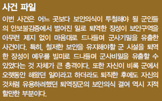 ±×·¸°Ô ÀÚ½ÅÀÇ ÀθÆÀ» ÀÌ¿ëÇØ ±¹¹æ¿¬±¸¼Ò¿¡ µé¾î°£ ±è ¼ÒÀåÀº ÇÚµåÆù Ä«¸Þ¶ó¸¦ ÀÌ¿ëÇØ¡®±¹¹æÁß±â°èȹ¡¯°ú ¿ì¸®±º 17 °³ ºÐ¾ß 100Á¾ÀÇ ¹«±â ÇöȲ°ú Áõ°¸ñÇ¥¸¦ À¯ÃâÇß´Ù. ÇÏÁö¸¸ S»ç°¡ ±º»çÀڷḦ ¼öÁýÇϰí Àִٴ øº¸¸¦ ÀÔ¼öÇÑ °ËÂû ÀÌ ¼ö»ç¸¦ °ÈÇÏ¸é¼ ±è ¼ÒÀåÀÇ °³ÀÔÀ» ¾Ë°Ô µÇ¾ú°í, ÀڷḦ ³Ñ±â±â Àü¿¡ üÆ÷µÇ¾ú´Ù. °á±¹ ±è ¼ÒÀåÀº ±º»ç±â¹Ðº¸È£ ¹ýÀ§¹Ý ÇøÀÇ·Î °ËÂû¿¡ ±¸¼ÓµÇ¸é¼ À̹ø »ç°ÇÀº ¸¶¹«¸® µÇ¾ú´Ù.